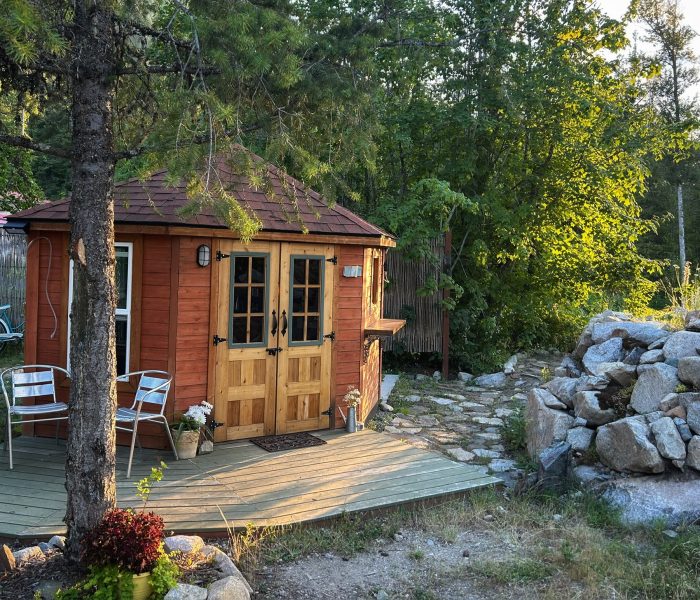 Welcome to Boho Bungalow, our rustic 10′ × 10′ log-cabin bunkie tucked against the forest’s edge and perched atop natural granite rock. We created this space for guests seeking a peaceful, grounding escape where nature, simplicity, and comfort come together. Whether you are traveling as a couple, a small family, or a solo guest wanting a quiet retreat, Boho Bungalow offers an atmosphere that encourages slowing down, relaxing, and reconnecting with the natural surroundings.
