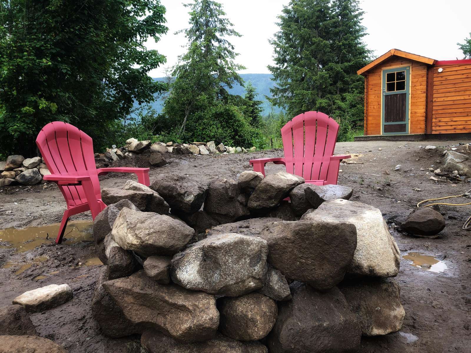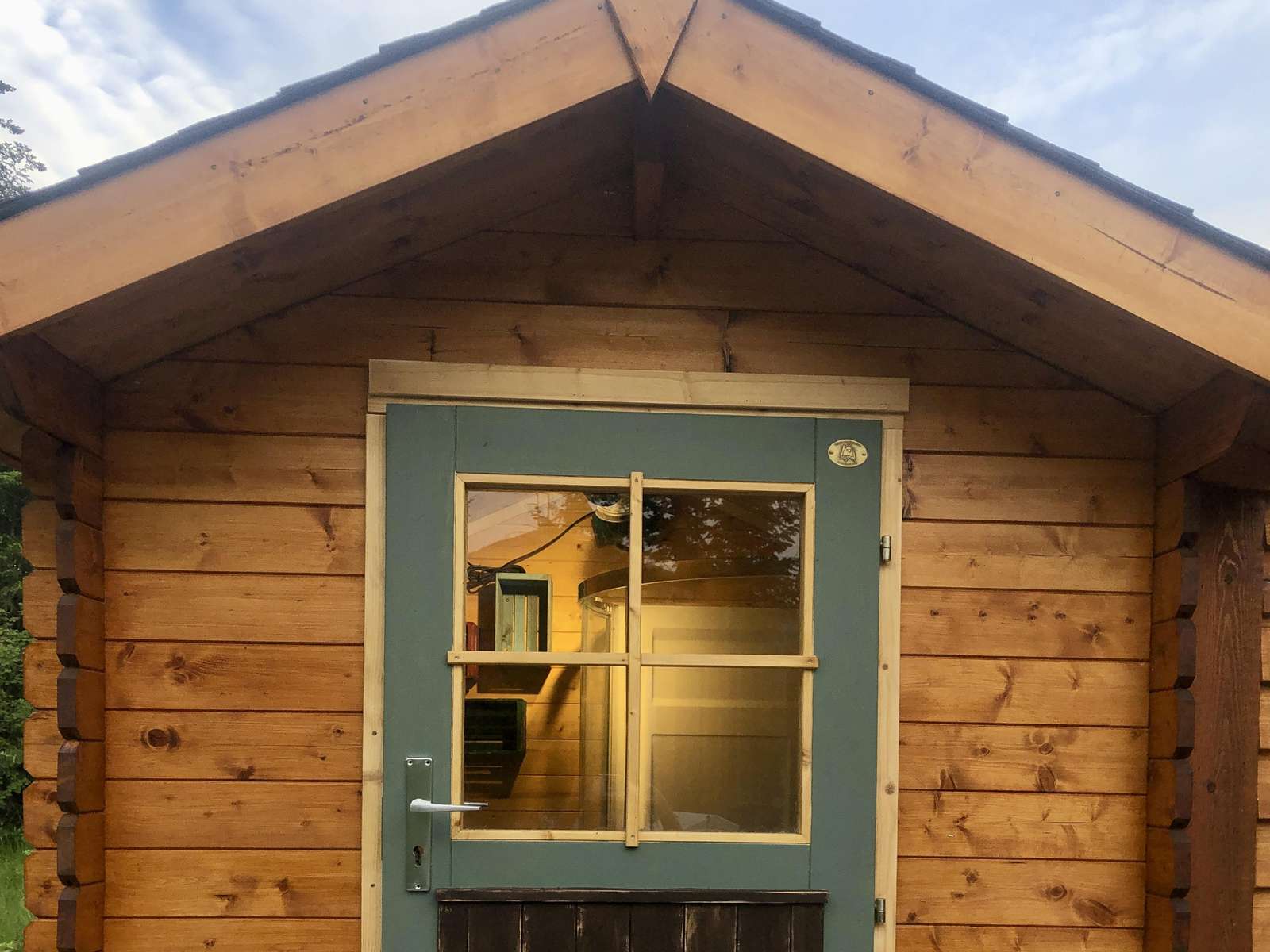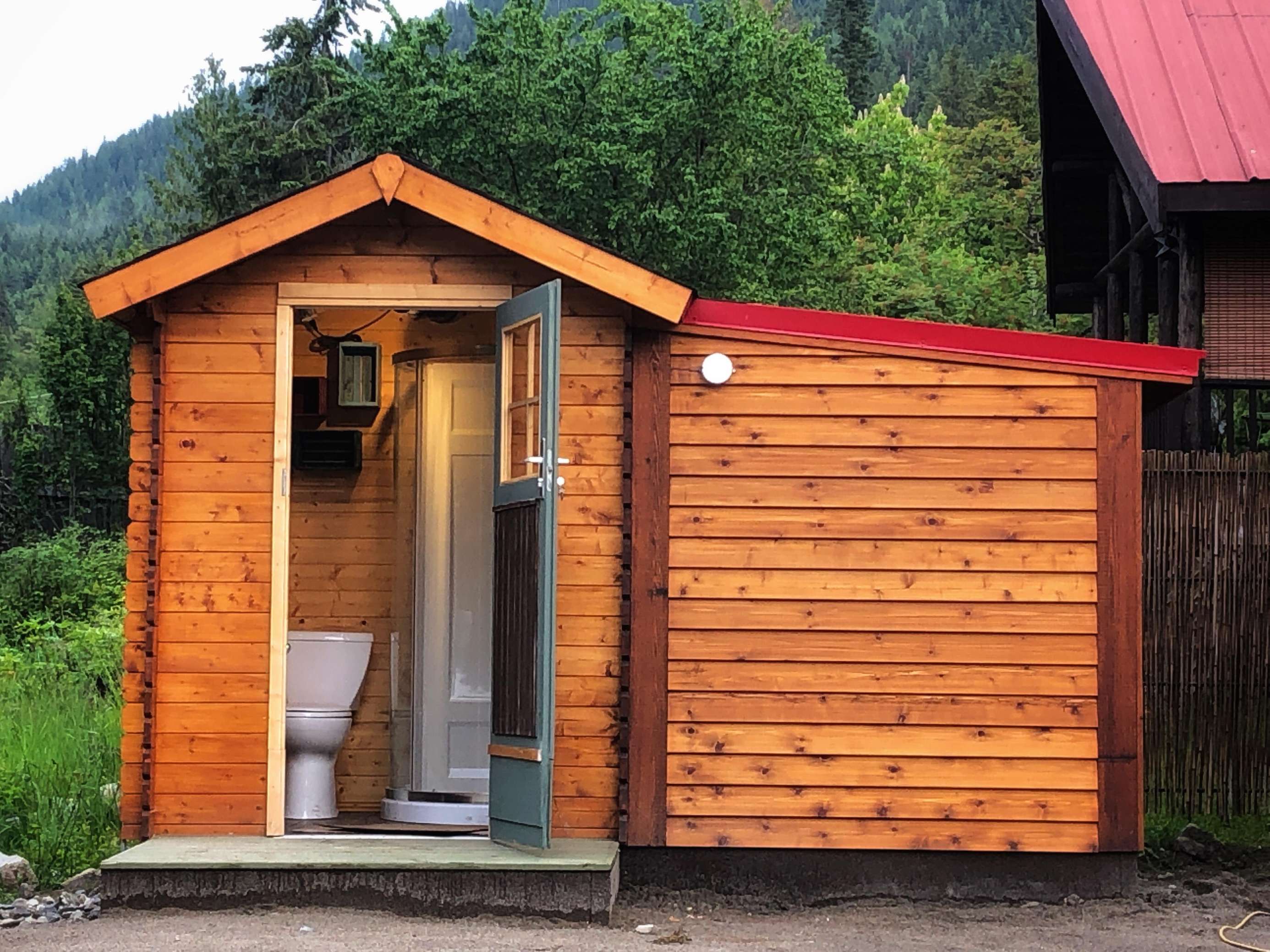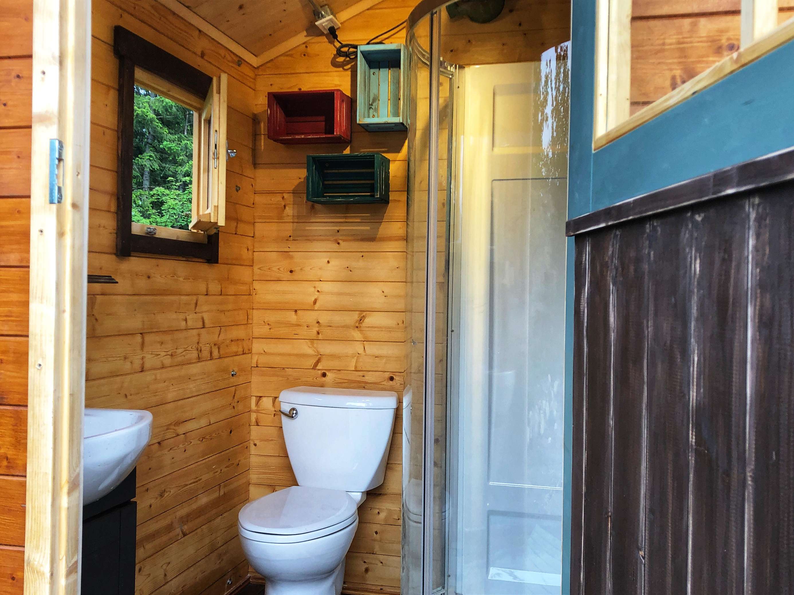 It has a shared three pc bath with hot running water, 2 flushing toilets, an outdoor shower, a fully equipped kitchen and a central firepit. There's a path to the forest that guests are welcome to visit and explore.