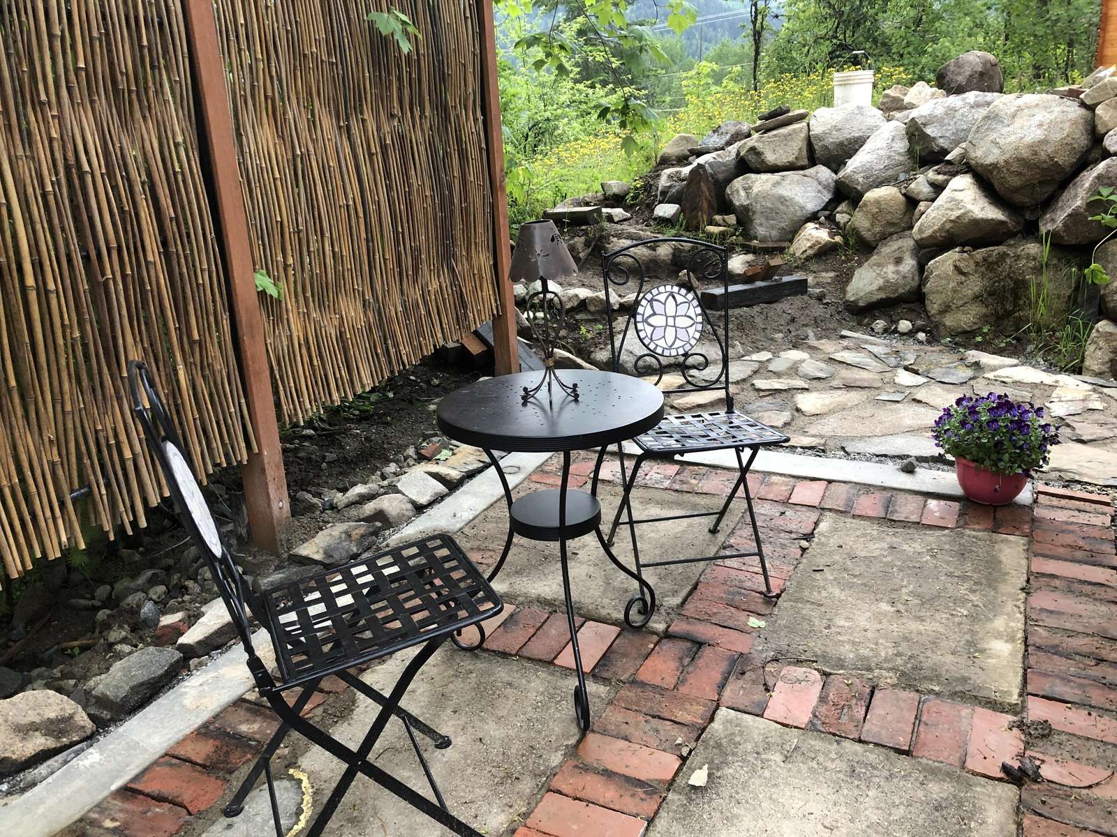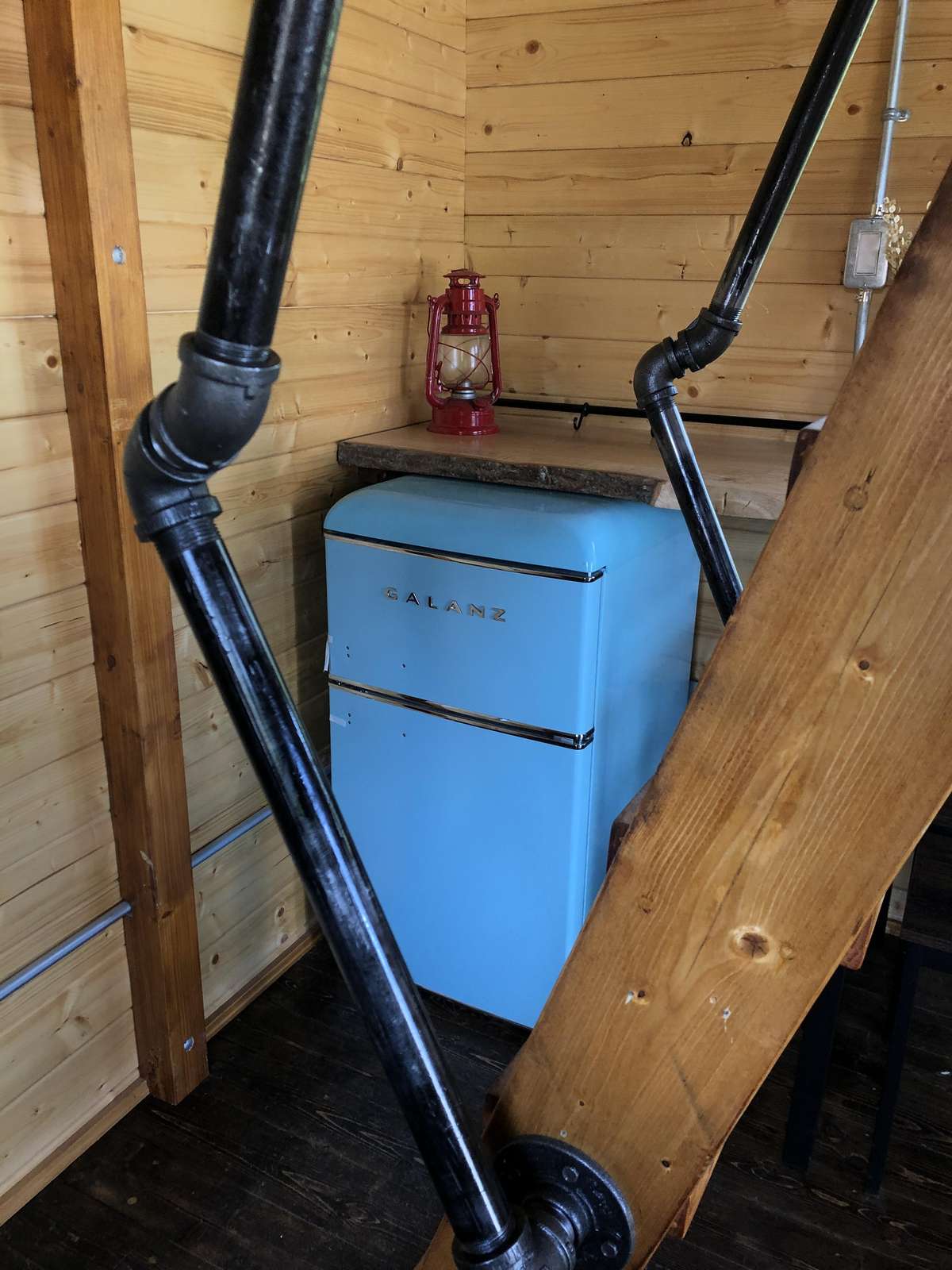 Boho Bungalow is a stand-alone 10'x10' bunkie with a spacious loft, retro mini-fridge, dining table, queen bed in the loft and a double futon on the main floor.